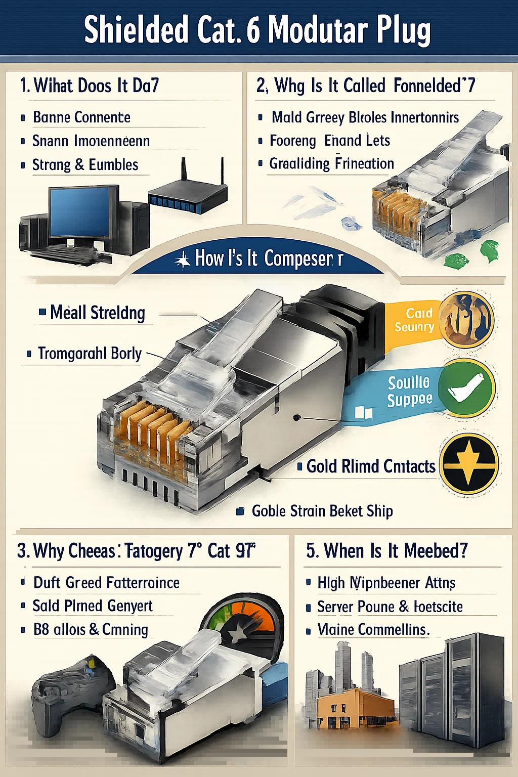 esto enchufe modular blindado Cat.6 En pocas palabras, es un conector de cable de red con un "blindaje protector". Si ha visto conectores de cables de red con una carcasa de metal brillante, eso es todo.